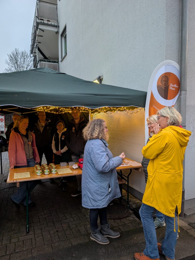 Die Husener Adventsmeile ist ein Event, das die Husener Straße in Vorfreude auf die Adventszeit in gemeinschaftlichen Charme taucht. Husener Geschäfte und Vereine kommen zusammen und veranstalten einen gemütlichen Abend mit Angeboten, Austausch und verschiedensten Köstlichkeiten. Auch Berthas Haus war zum ersten Mal dabei. Unser Stand neben Optik Landfester bot Chili con/sin Carne und leckere selbstgemachte Weihnachtsmarmelade an, welche sich schnell großer Beliebtheit erfreuten. Auch Husener Honig von Marcus Eßer und Kalender des lokalen „Ateliers für Jedermann“ konnten bei uns erworben werden, wovon ein Teil des Erlöses außerdem an Berthas Haus ging. Wir bedanken uns sehr für die Unterstützung und auch bei allen, die tatkräftig geholfen haben.